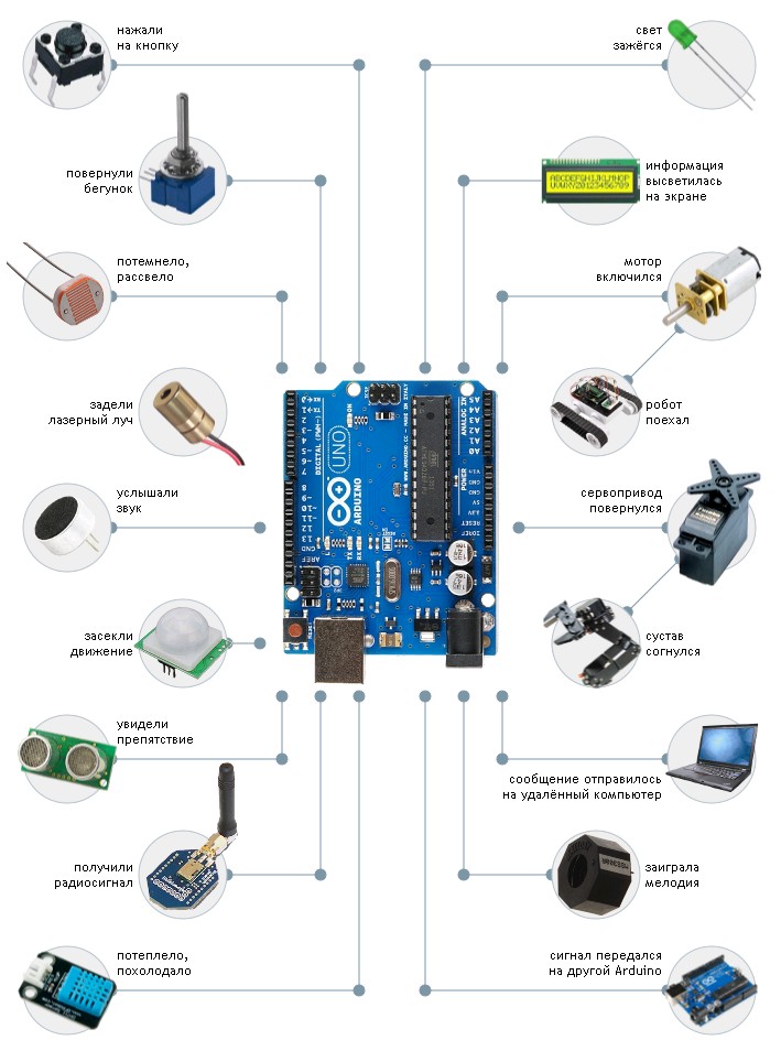 В процессор Arduino можно загрузить программу, которая будет управлять всеми этими устройствами по заданному алгоритму. Таким образом можно создать бесконечное количество уникальных классных гэджетов, сделанных своими руками и по собственной задумке. Для того, чтобы понять идею, взгляните на иллюстрацию. Она не отражает и миллионной доли всех возможностей, но всё же даёт первичное представление: