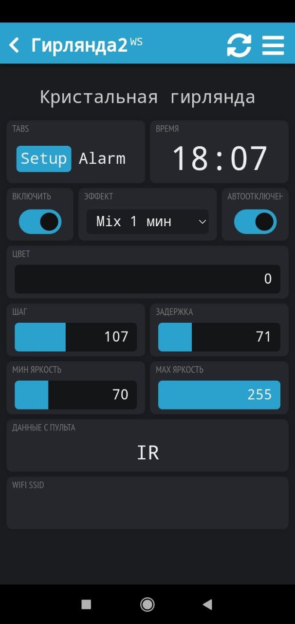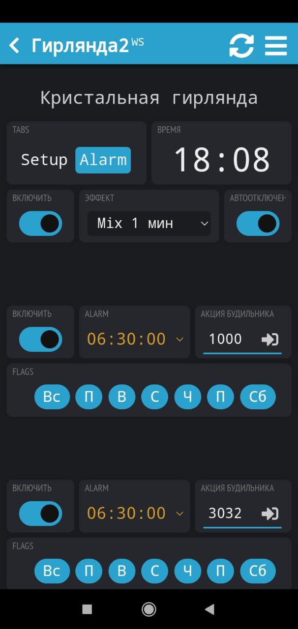Будильники умеют включать/выключать гирлянду, менять яркость, цвет, эффект