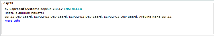 в Менеджере плат находим esp32 и устанавливаем.Версия 2.0.17 последняя из стабильных. Версия 3 еще сырая и не работает с fastled.