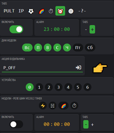 Указывается время, дни недели, когда необходимо выполнять командуВводится команда, например P_ON или P_OFF