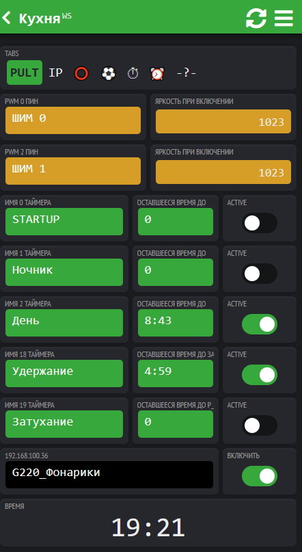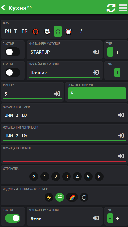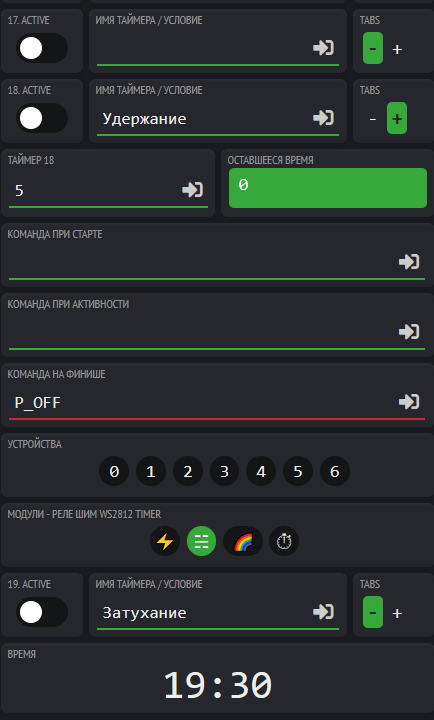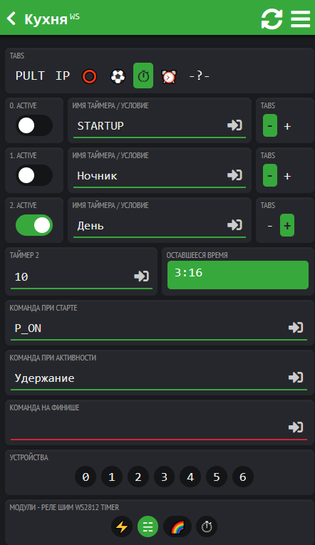В закладке Таймера создаются Таймеры Ночник на 5 минут, День на 10 минут и Удержание на 5 минут.