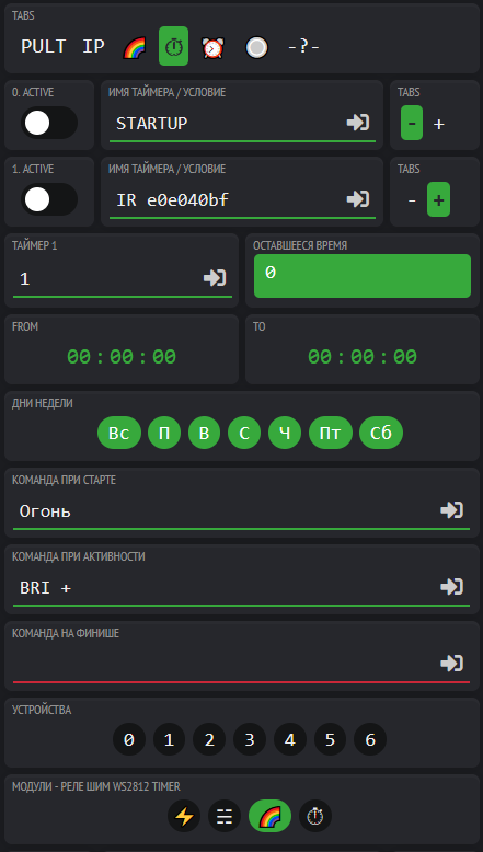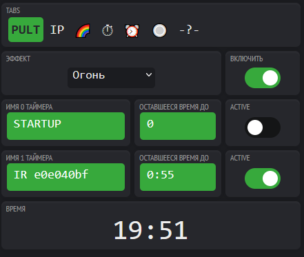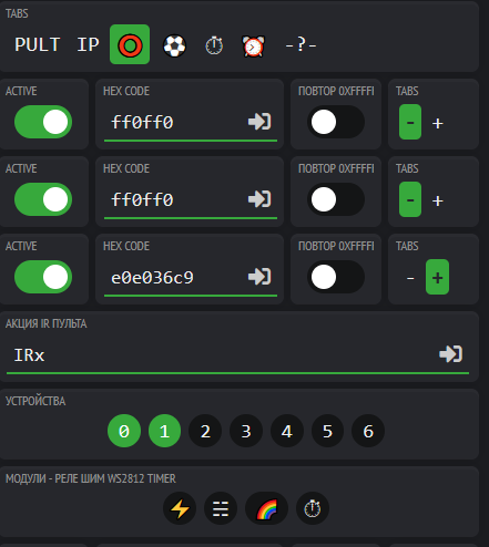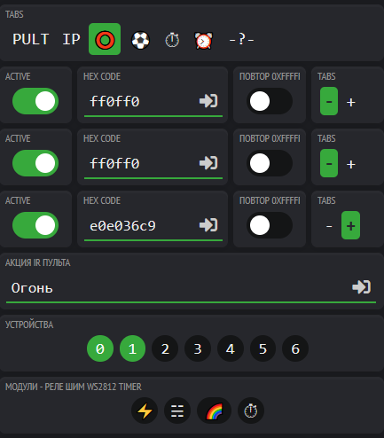 2) указываем, какие коды и каких пультов пересылаются на какие лампы IRx (код в 16-ти ричном виде). Либо Можно вместо кода вписывать сразу команду, например название эффекта Огонь.
