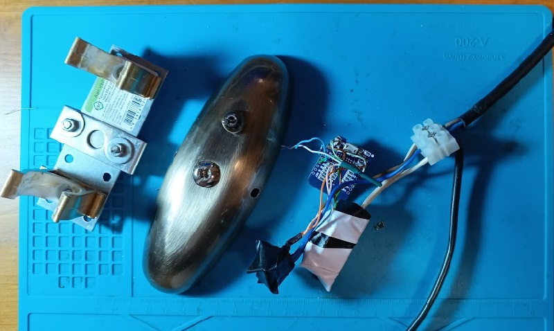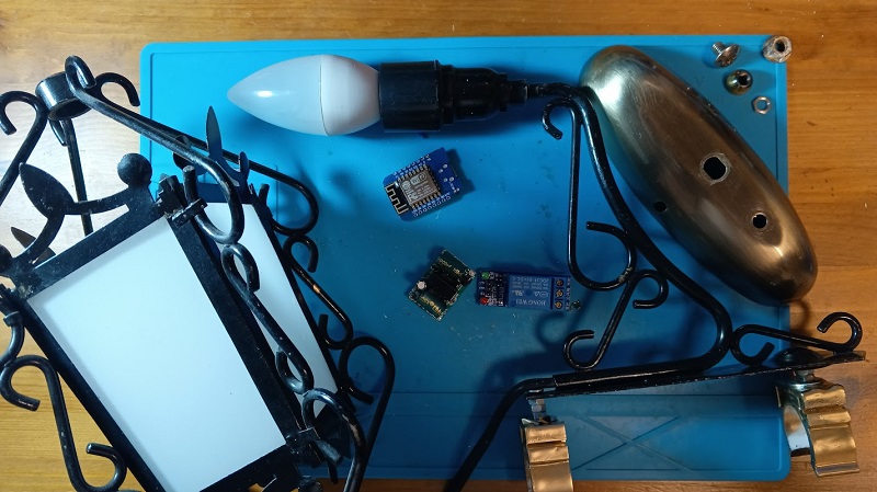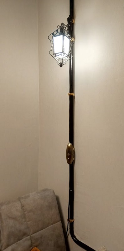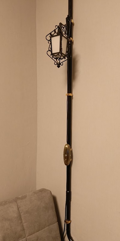 Крепим на трубу отопления с помощью покрашенного в бронзу сантеха фонарь, модуль управления и крепеж для проводки.